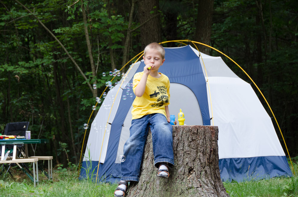 One of the last-minute, spur-of-the-moment things I picked up was a butterfly net and bubbles at Target. That was the best $6.00 ever spent! Preston wore himself out chasing bugs all over the site, and in the creek. Preston also decided at the last minute to take some of his blocks and a train set. I said, “Sure! we have room in this van! They also kept him occupied in camp while I did other things (like try to rest in the hammock – until he found me).